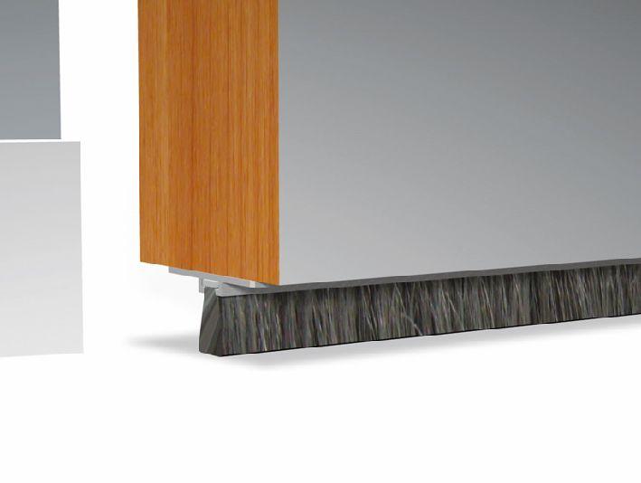 Bas de porte en aluminium composé d'un support en aluminium et d'une brosse souple en polypropylène antistatique.